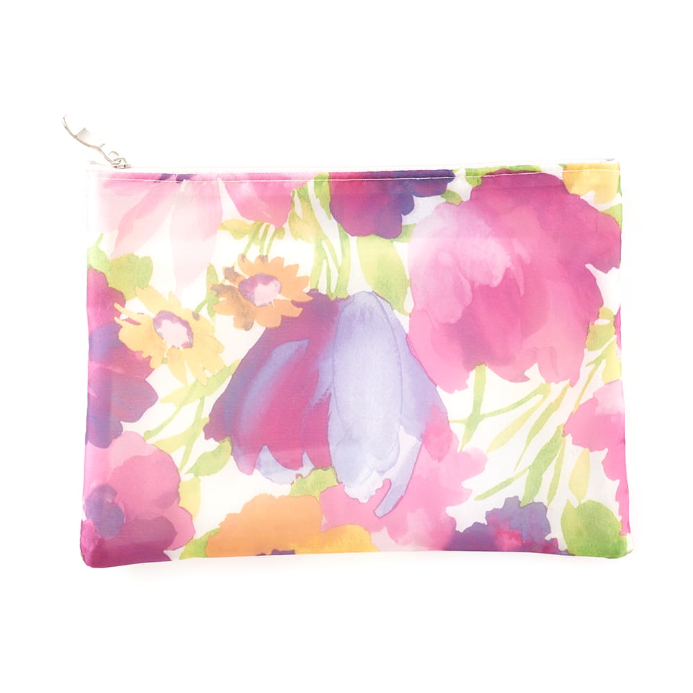 日本製オーガンジー生地を使用した華やかなマルチポーチ。裏地には無機銀系抗菌処方をしたフィルムを使用。撥水性にも優れており、ちょっとした濡れたものを入れても安心です。中には、仕切りにもなる本体と同じサイズ(横)の大きめポケット付。マスクなどもストレスなくスムーズに出し入れできます。商品仕様
