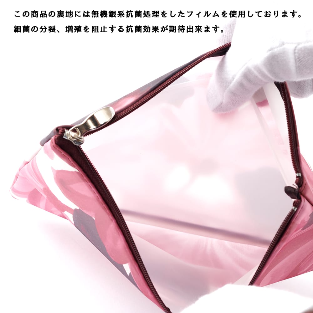 抗菌:この商品の裏地には無機銀系抗菌処理をしたフィルムを使用しております。細菌の分裂、増殖を阻止する抗菌効果が期待できます。