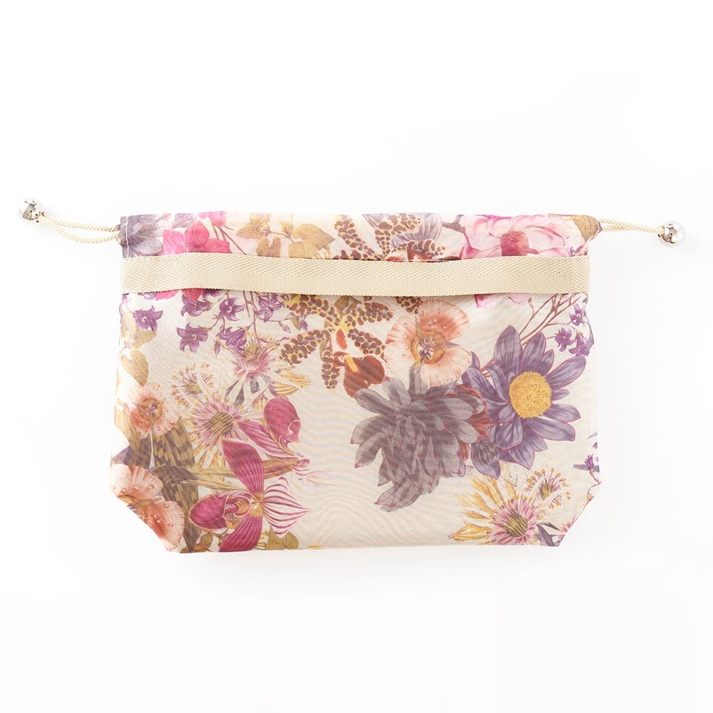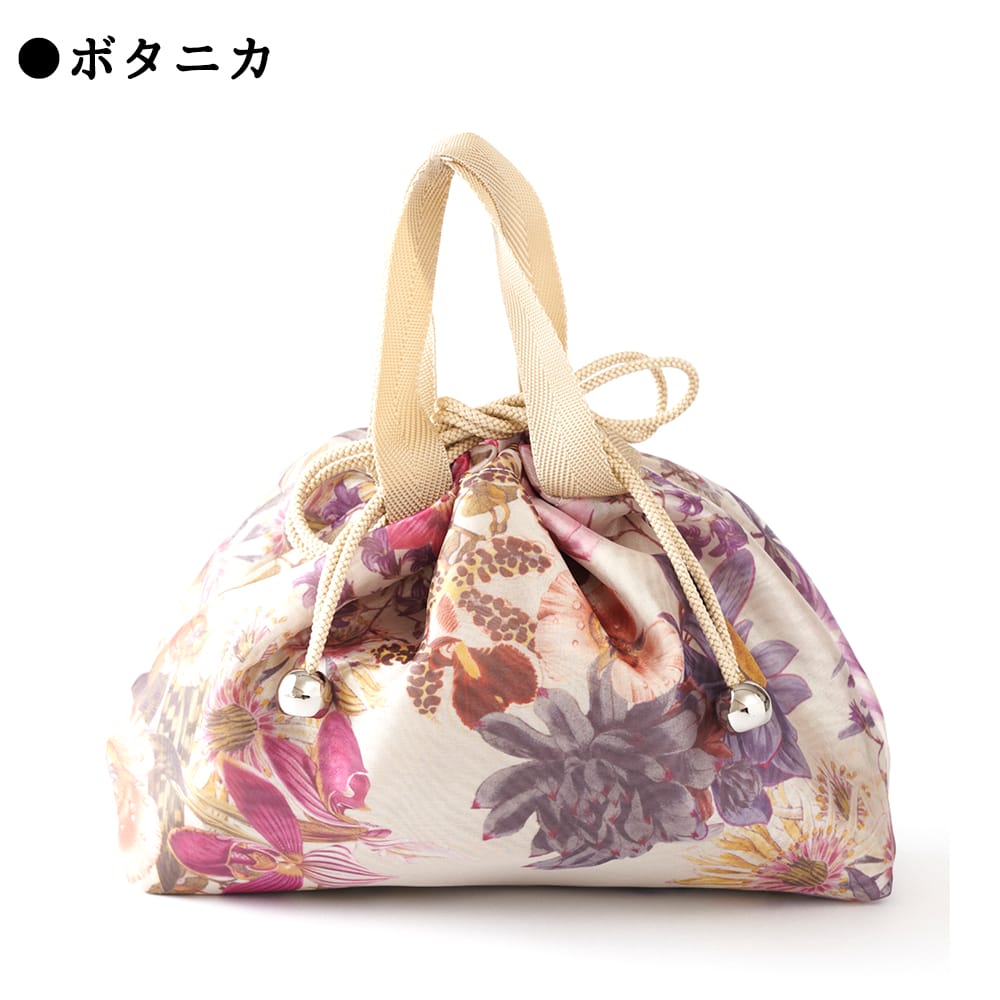 | 花柄が色鮮やかな巾着バッグ。おしゃれな仕様で、ちょっとしたお出かけ時のアクセントにピッタリ。レトロな雰囲気を合わせ持つトレンド商品です。巾着を絞るとテープが持ち手になります。 |